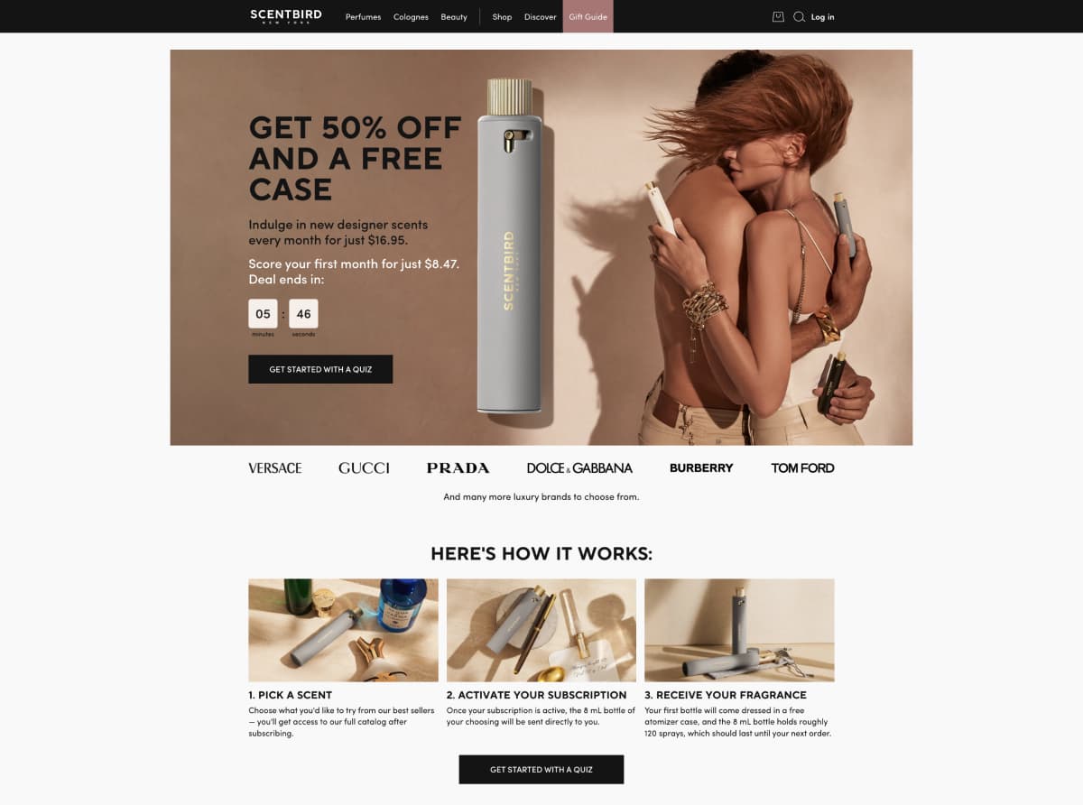 ScentBird directed new users to a landing page with prompts on how their process worked, with a variety of buttons channeling users to view their product offerings and sign up.