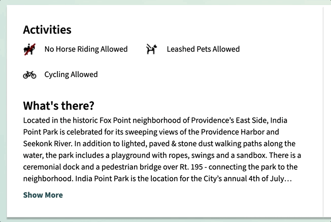 Redesign and development of the Explore Rhode Island park page, often the first result when searching for information on local parks and trails. Site contained information such as ADA accessibility information hard to find elsewhere - a significant motivation to my redesign.